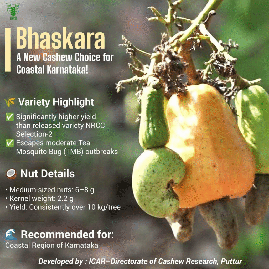 कर्नाटक के तटीय इलाकों के लिए विकसित की गई काजू की नई किस्म “भास्करा” ज्यादा उपज देने वाली और कीट-रोधी है। यह टी मच्छर कीट के मध्यम प्रकोप से बचती है, मध्यम आकार के दाने देती है और एक पेड़ से 10 किलो से ज्यादा उत्पादन करती है। ICAR-पुत्तूर द्वारा विकसित यह किस्म स्थानीय किसानों के लिए बेहतर और लाभदायक विकल्प मानी जा रही है।