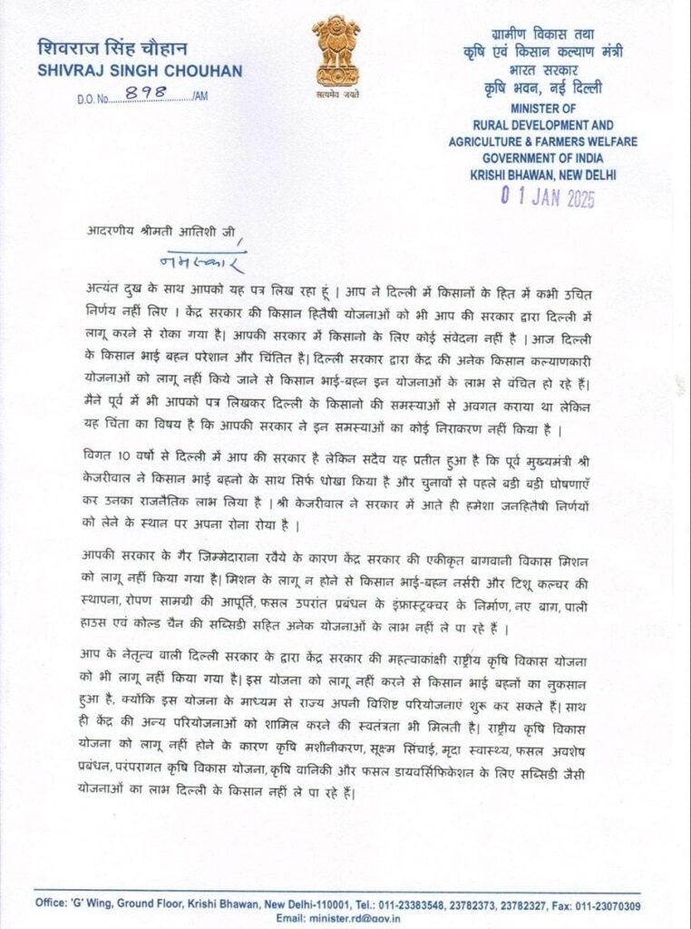 केंद्रीय कृषि मंत्री शिवराज सिंह चौहान ने दिल्ली के किसानों के लिए दिल्ली की सीएम आतिशी को पत्र लिखा। पत्र में उन्होंने दुख जताते हुए लिखा कि पिछले 10 वर्षों से दिल्ली में AAP की सरकार है, लेकिन पूर्व सीएम केजरीवाल ने हमेशा किसानों के साथ केवल धोखा किया है।केंद्र सरकार की किसान हितैषी योजनाओं को आम आदमी पार्टी की सरकार ने दिल्ली में लागू नहीं किया है।दिल्ली के किसान केंद्र की कल्याणकारी योजनाओं के लाभ से वंचित हो रहे हैं।